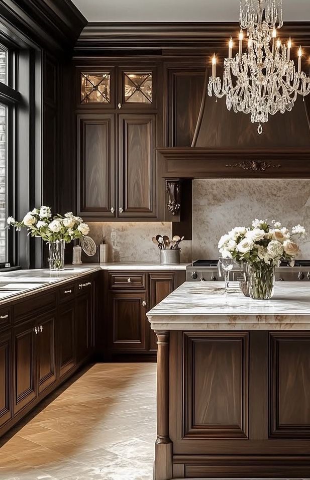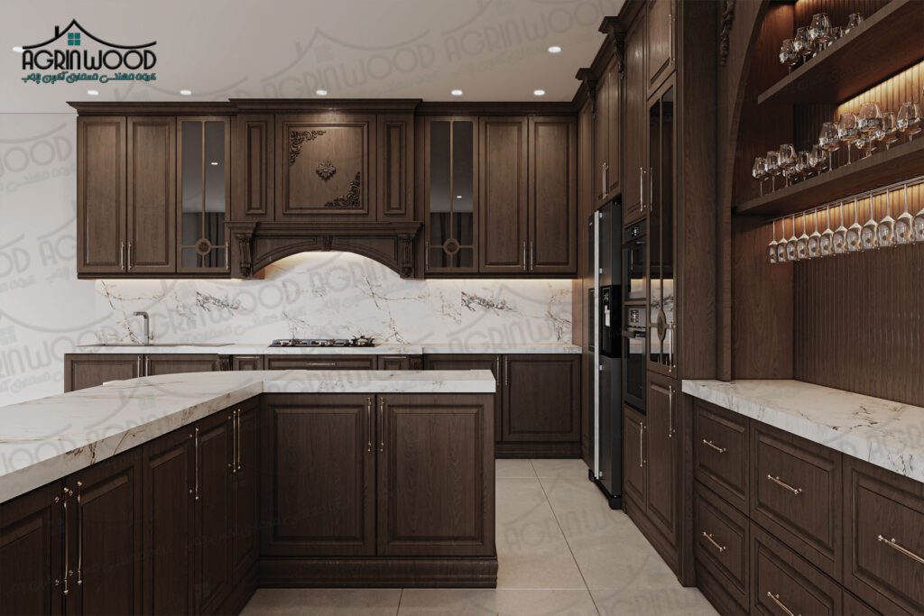 کابینت روکش چوب با رنگ گردویی تیره از پرطرفدارترین انتخابها برای سبک کلاسیک است.