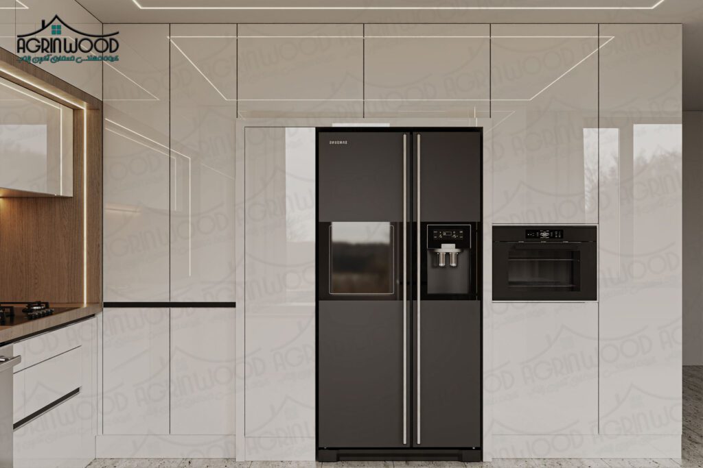 مشکی براق همچنین جزئیات و خطوط کابینت را برجسته میکند و جلوهای مدرن و حرفهای به آشپزخانه میدهد.