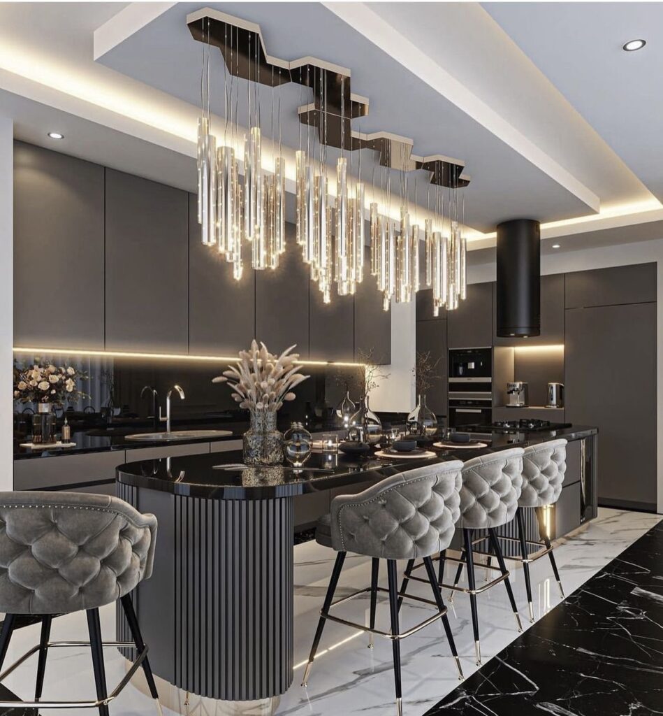 در مقابل، هایگلاس و روکش چوب طبیعی جلوهای خاص و لوکس به آشپزخانه میبخشند.
