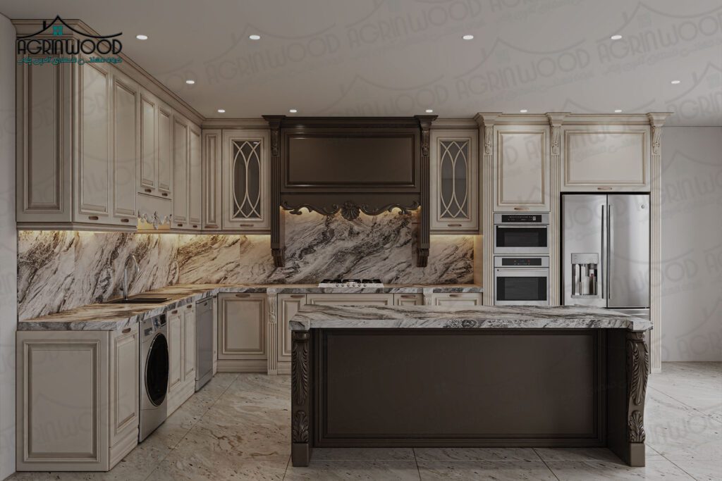 آشپزخانه همزمان کلاسیک و امروزی به نظر برسد و جذابیت بصری محیط افزایش یابد.