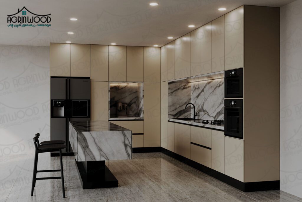 کابینتهای کرم، در کنار سنگهای مرمر سفید یا کف چوبی روشن، جلوهای کلاسیک و لطیف دارند.