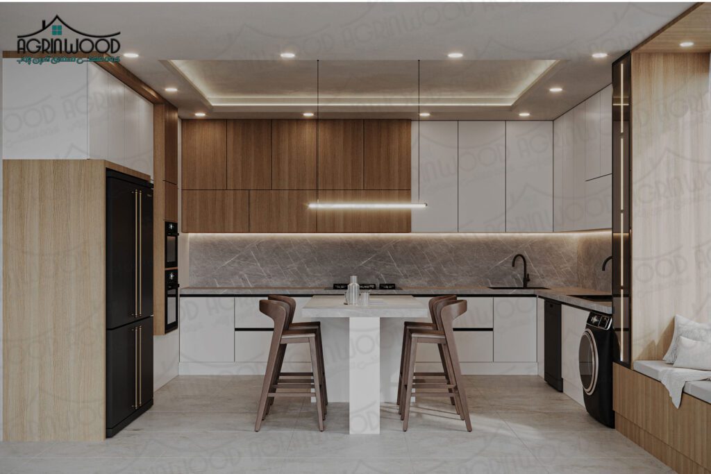 ترکیب چوب با رنگهای سفید یا طوسی، یکی از ترندهای محبوب طراحی آشپزخانه است.