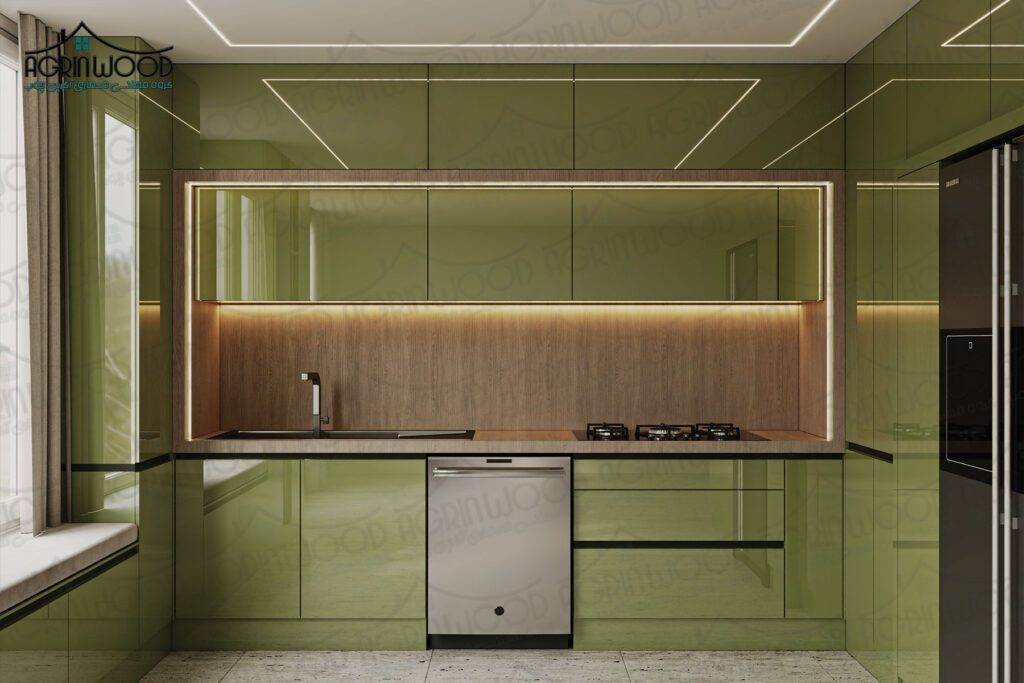 رنگ سبز زیتونی نمادی از آرامش و طبیعت است. انتخاب این رنگ برای کابینتها،