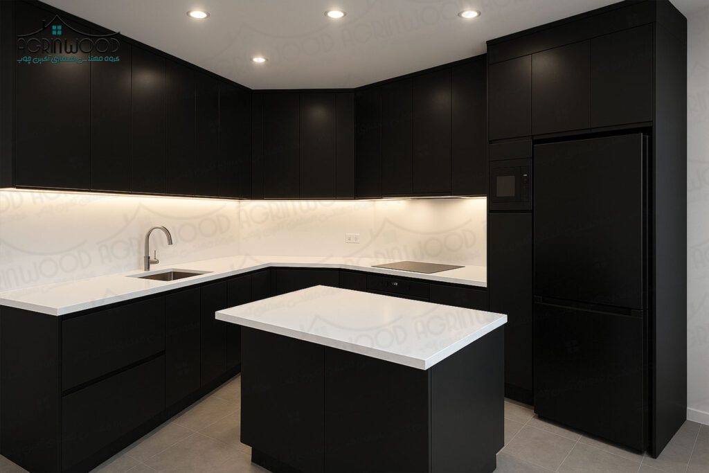 کابینتهای ام دی اف مشکی به آشپزخانه ظاهری مدرن، لوکس و جذاب میبخشند.