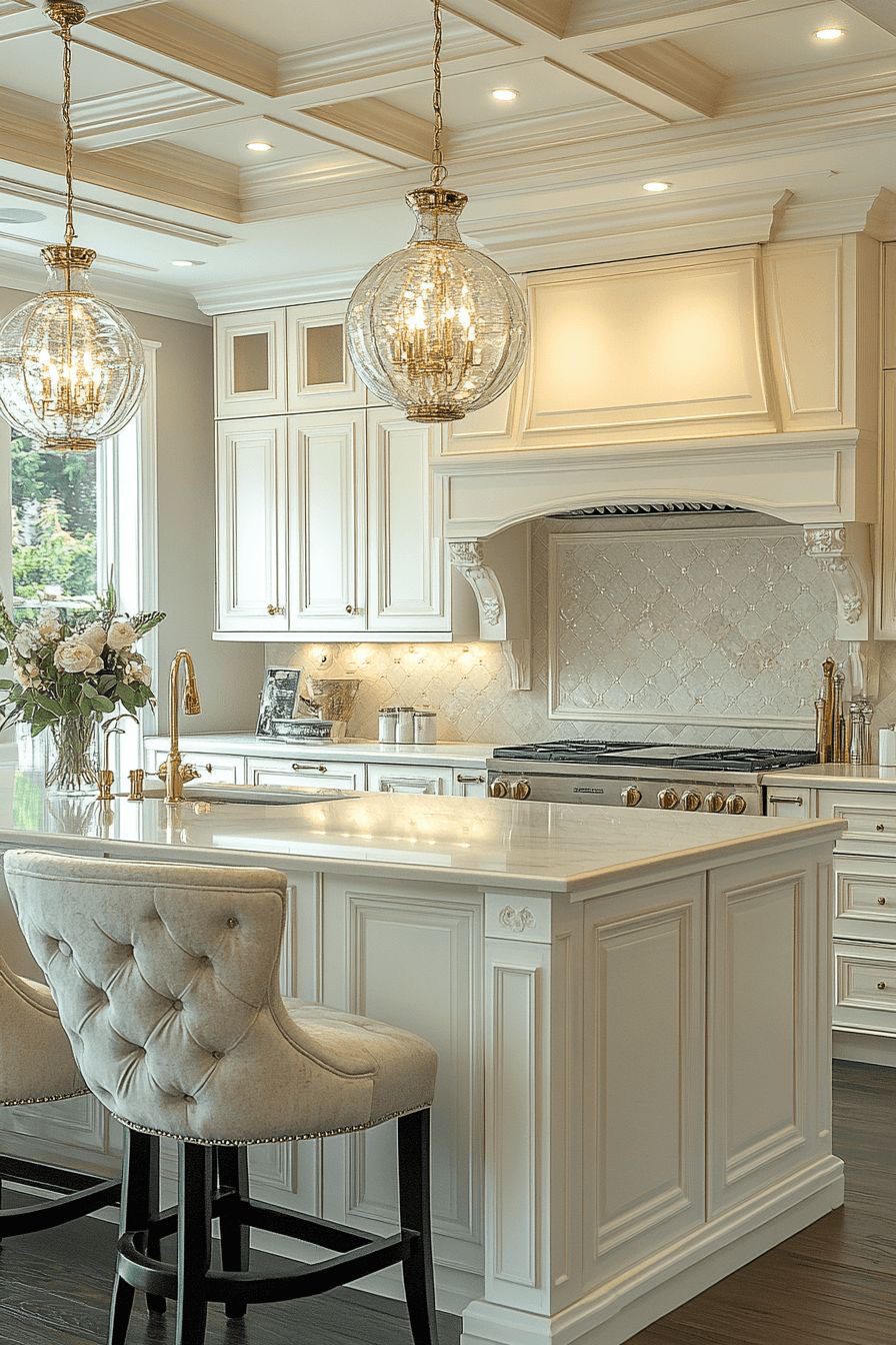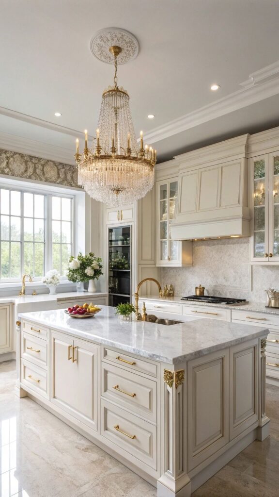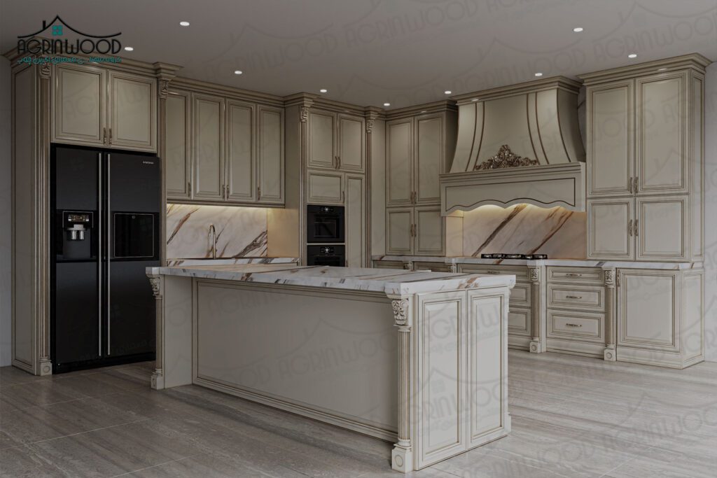 کابینتهای کرم ممبران با منبتکاریهای ظریف و تاجهای تزئینی،