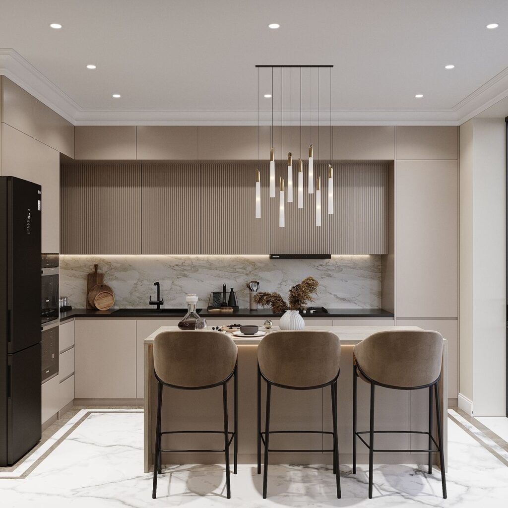 ترکیب آن با نورپردازی خطی و دستگیرههای ظریف، جلوهای مدرن و هماهنگ به فضا میبخشد.