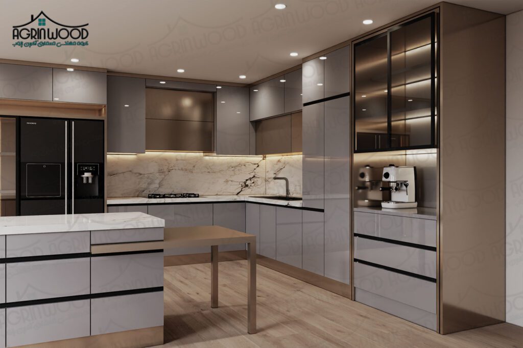 کابینت هایگلاس با سطح براق و آینهای خود، نمادی از آشپزخانههای مدرن و مینیمال است.