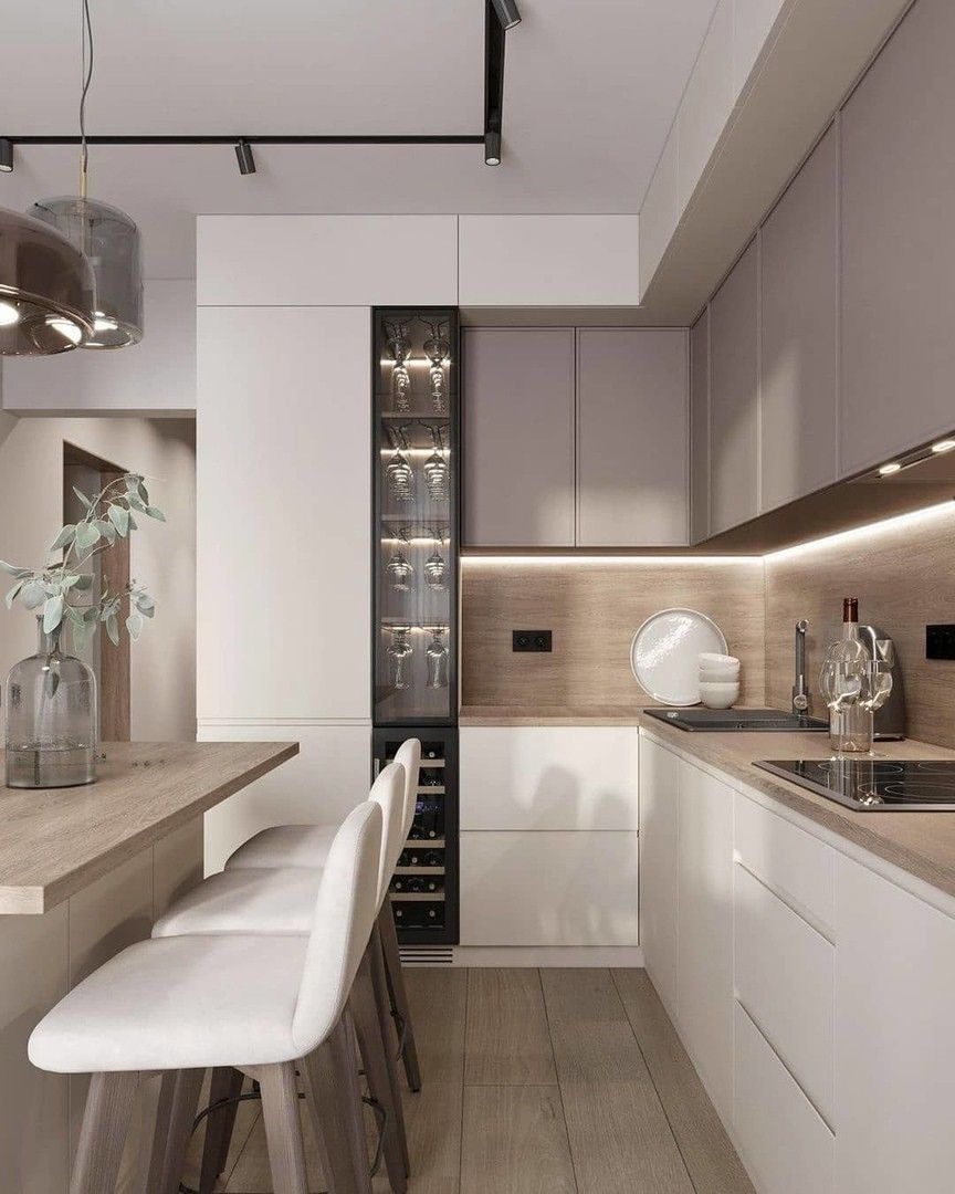 ترکیب رنگ سفید برای دربها و طوسی برای بدنه، ظاهری زیبا و مدرن به آشپزخانه میبخشد.