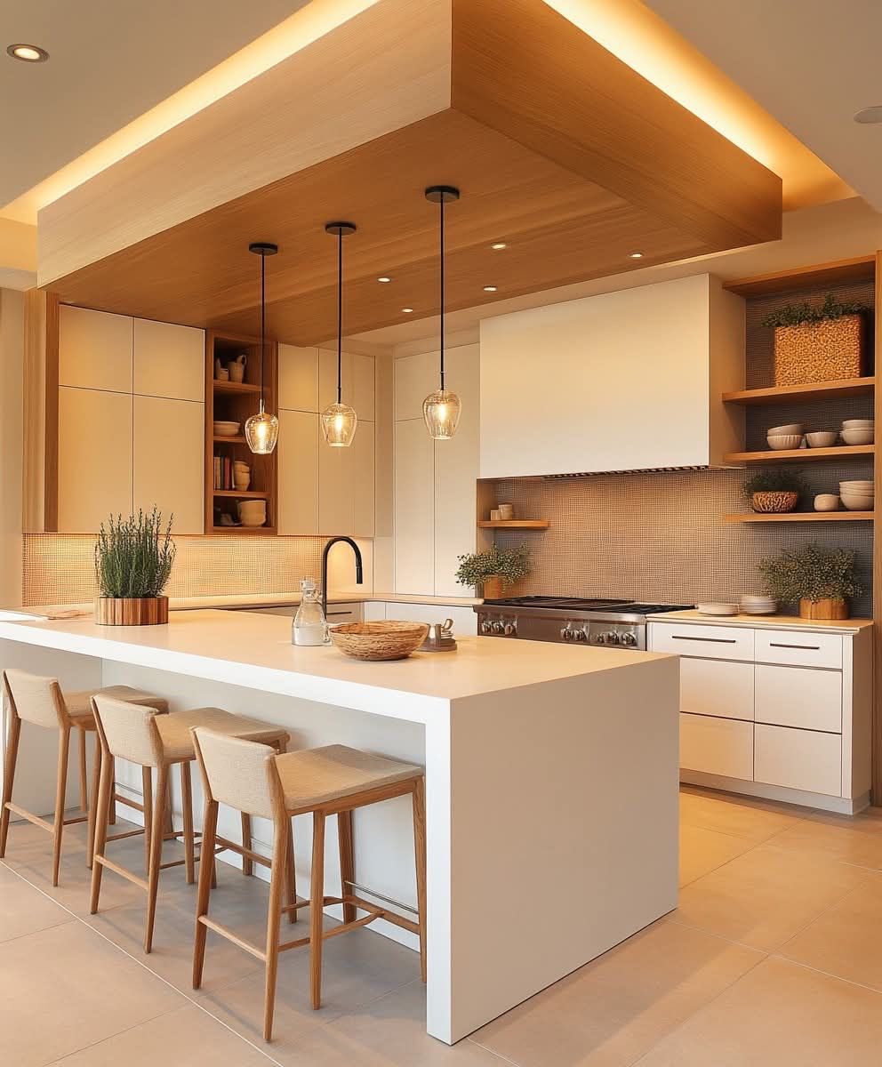 ترکیب کابینتهای طرح چوب با رنگهای روشن مانند سفید یا کرم، جلوهای زیبا و متعادل در آشپزخانه ایجاد میکند.
