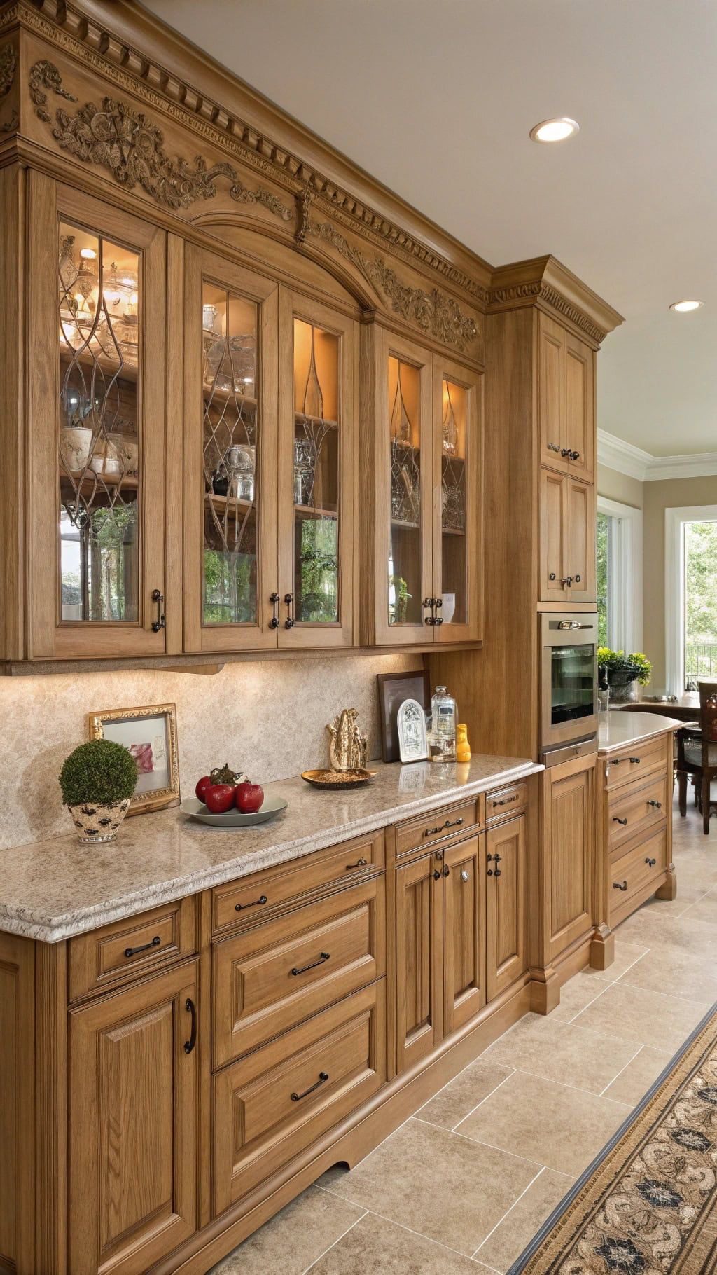 این نوع کابینتها رایج است که باعث ایجاد حس گرمی و شکوه در فضای آشپزخانه میشود.