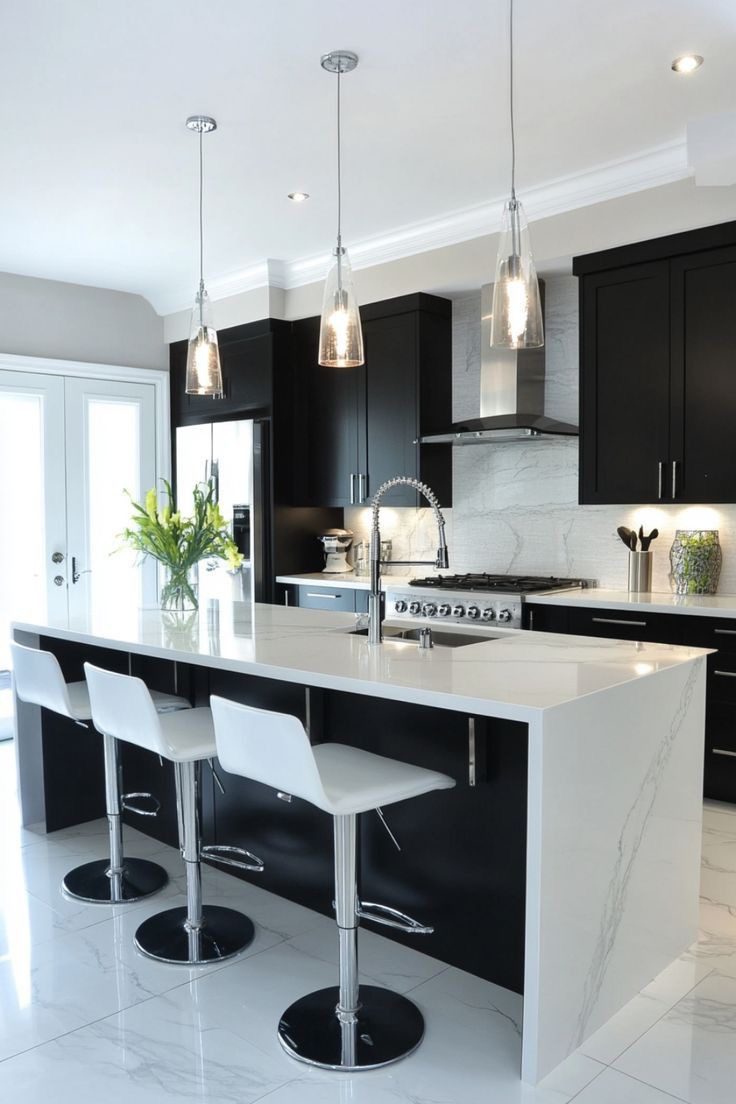 جزیره میتواند بهعنوان نقطه کانونی در آشپزخانه عمل کند و با ترکیب رنگ سفید و مشکی،