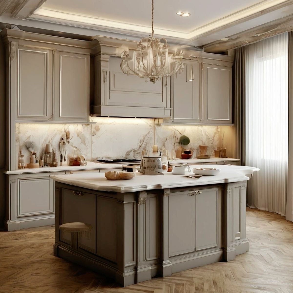 یکی از بزرگترین مزایای کابینتهای نئوکلاسیک رنگشده، امکان اجرای طرحهای سفارشی و پیچیده است.
