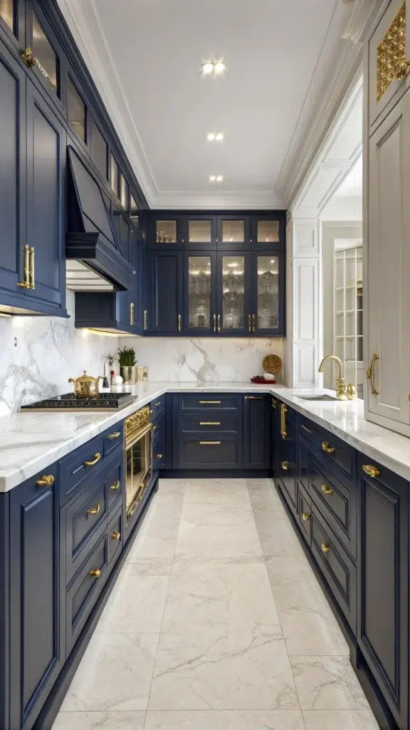 کابینت نئوکلاسیک سرمهای انتخابی لوکس، ماندگار و شخصیتدار برای آشپزخانه است.