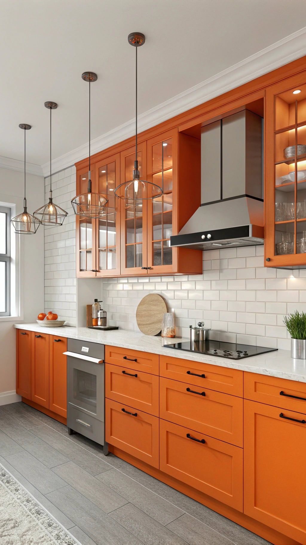 ترکیب نور و رنگ نارنجی، حس انرژی و شادابی را در فضا تقویت کرده و به کابینت جلوهای مدرن و لوکس میبخشد.