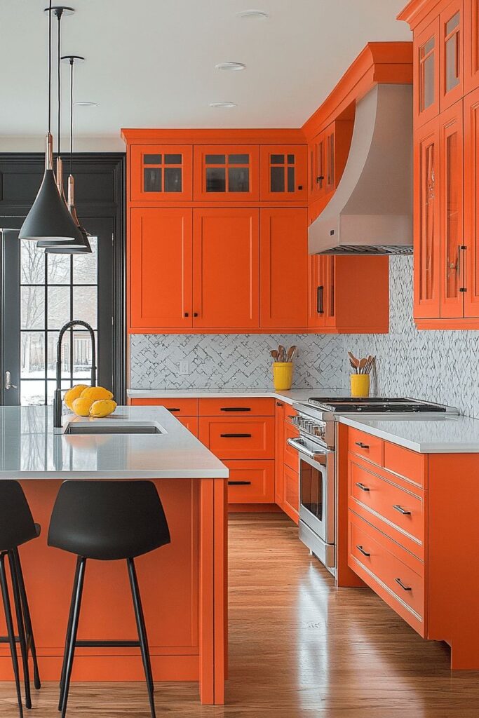 رنگ نارنجی در کابینت نئوکلاسیک، انرژی، شادابی و گرما به آشپزخانه میآورد.