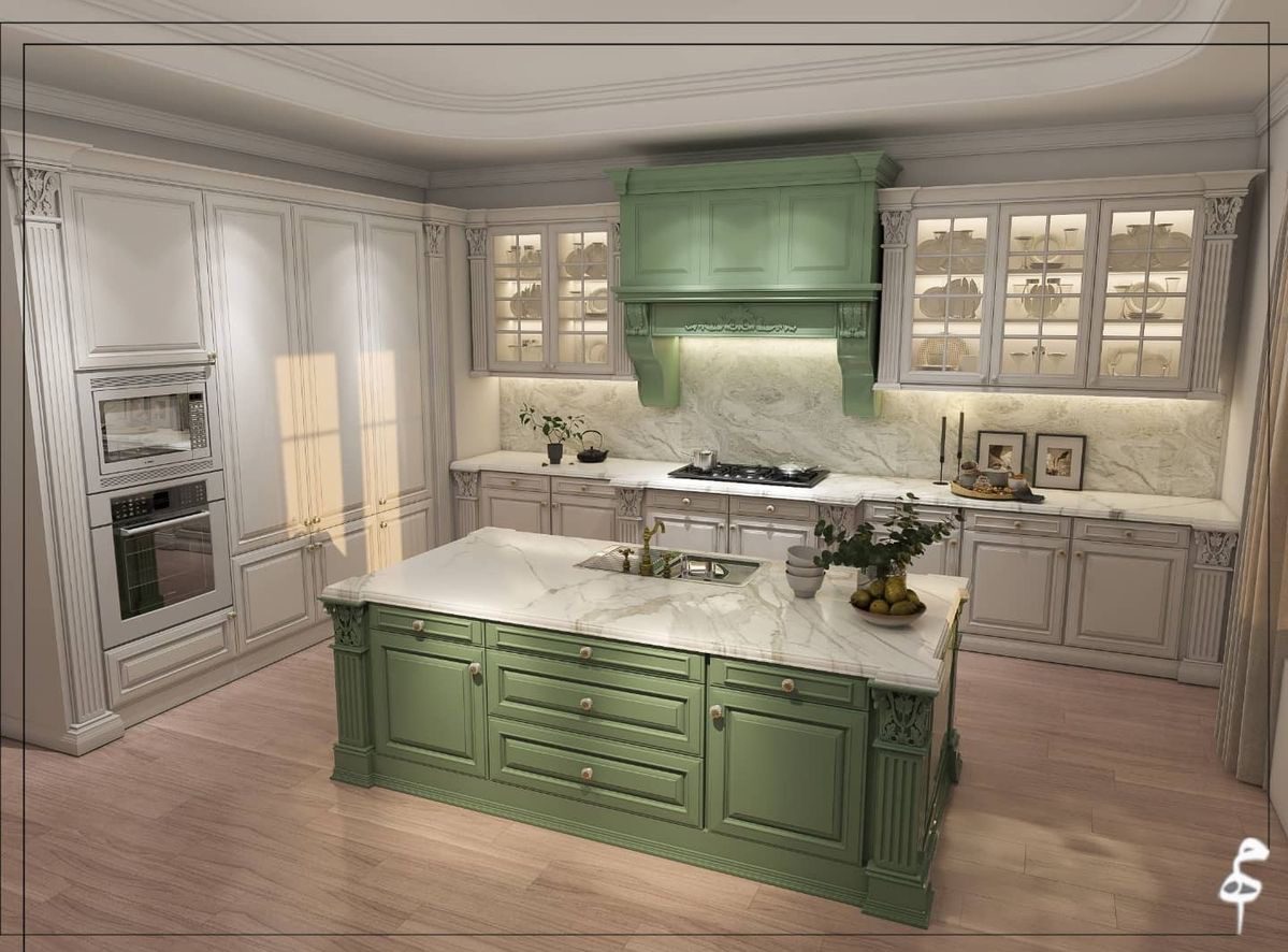 استفاده از جزئیات حکاکی شده روی دربهای کابینت و دستگیرههای نقرهای،