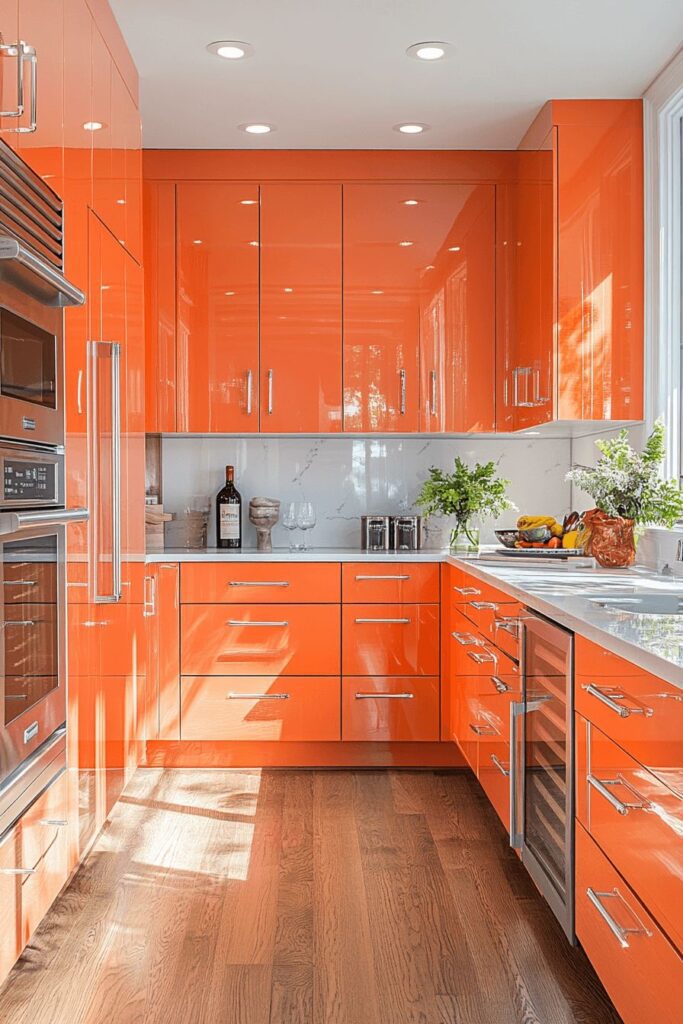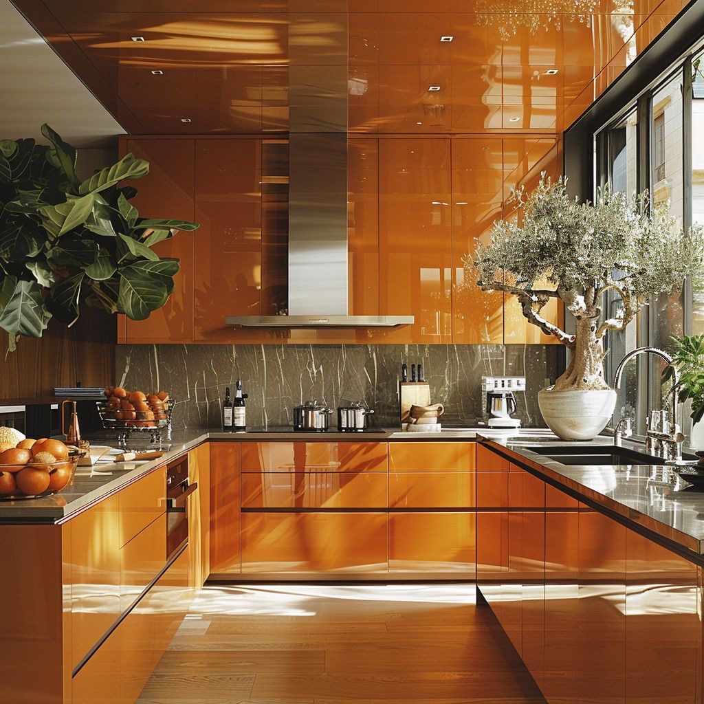 کابینتهای پلی گلاس نارنجی بهدلیل سطح براق و آینهمانند خود،