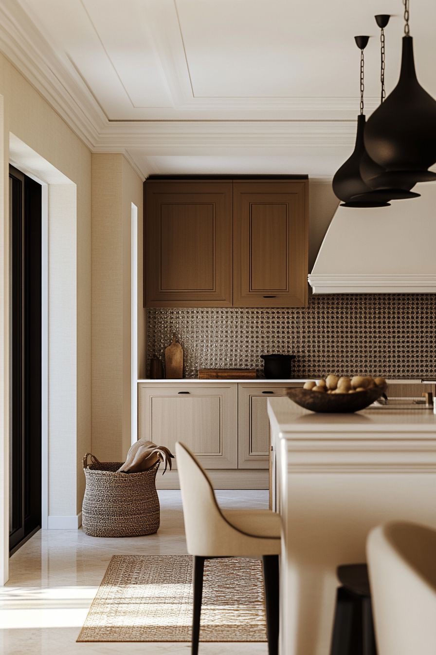 تضاد رنگی رسمی و آرامشبخش است و جلوهای لوکس به فضای آشپزخانه میدهد.