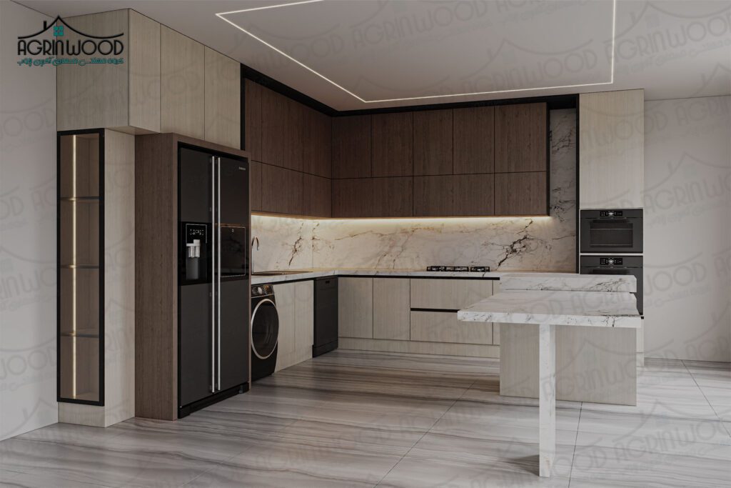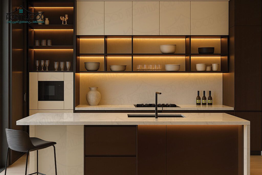 گزینهای عالی است. این سبک با توجه به سلیقه میتواند شامل کابینتهای پایینی تیره