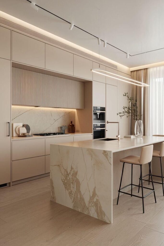 کابینتهای مات با رنگ کرم، جلوهای آرام و مینیمال به آشپزخانه میدهند.