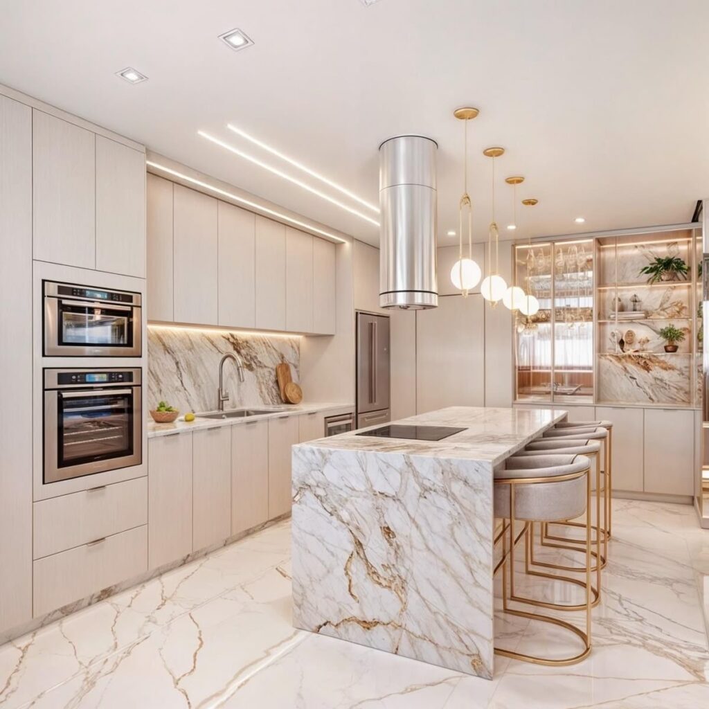 یکی از ایدههای رایج، ترکیب کابینتهای کرم براق با صفحه کابینت سنگی